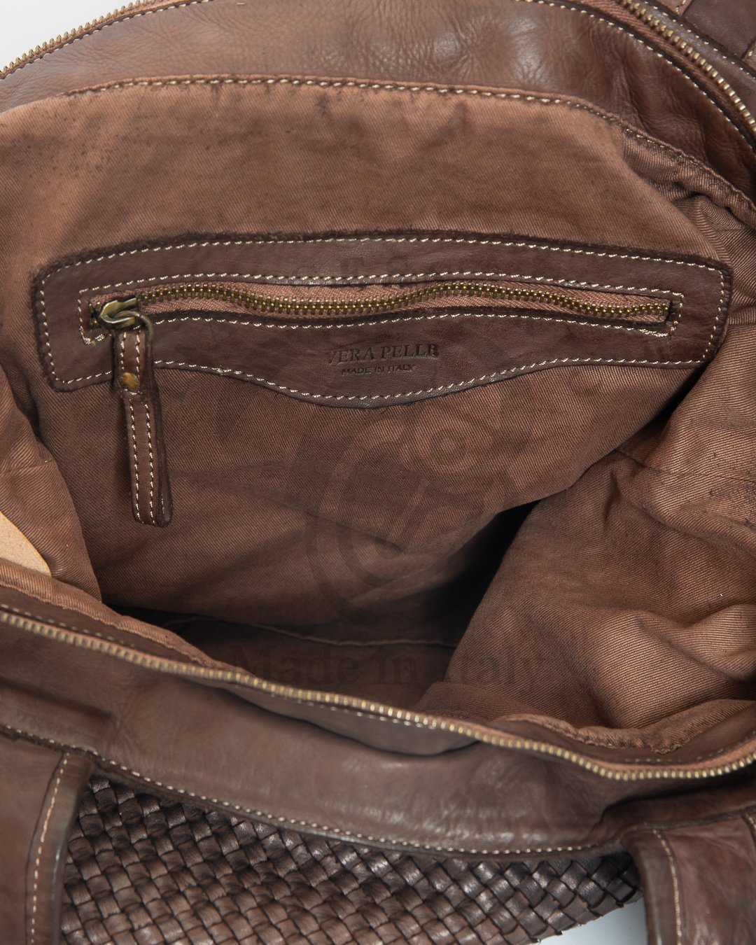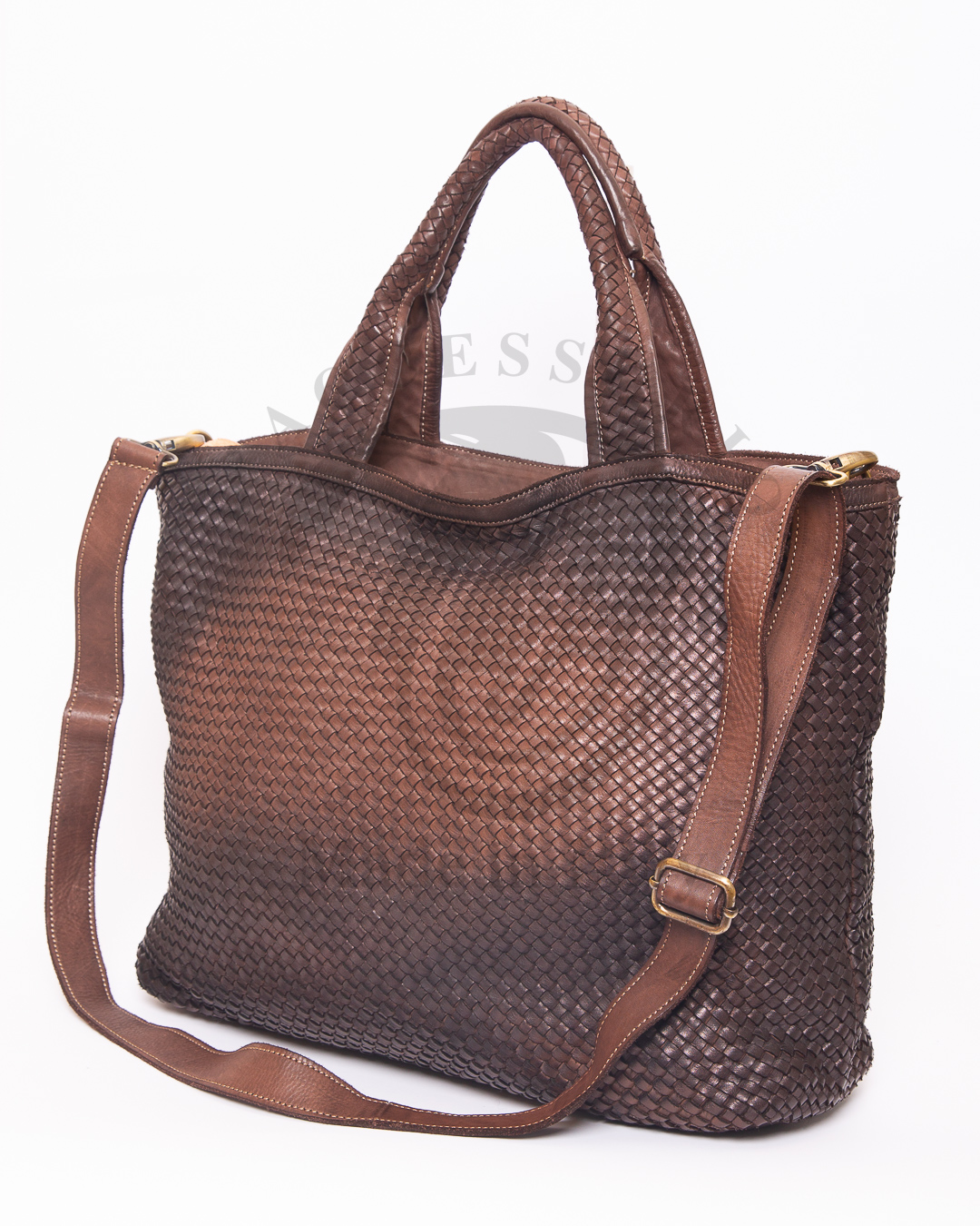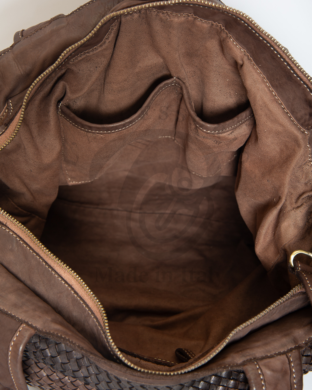 La “Dalì” è una borsa artigianale intrecciata a trama fitta. La pelle,aerografata ai bordi, ottiene l’effetto vintage con la tecnica del lavato in capo. Splendido modello shopping grande, da portare a mano oppure con tracolla regolabile e rimovibile. Modello gradevole per il design minimal, la sua comodità e capienza. Chiusura principale a zip. Interno in cotone, spazioso con tre tasche di cui una con chiusura a zip Misure: L 42 cm H 32 cm 50 cm (con manici) P 13 cm